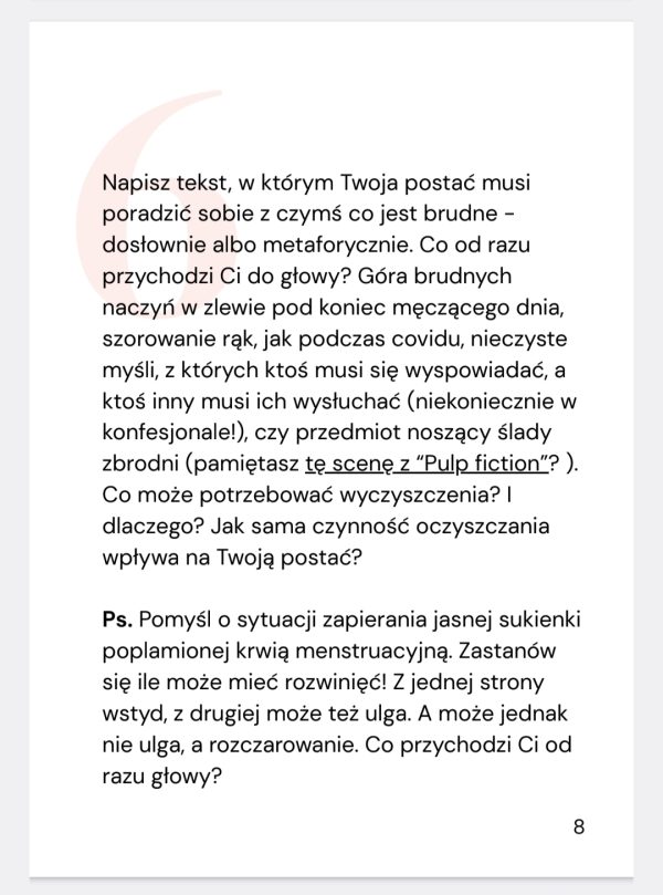 Do 30 pomysłów na opowiadania, 15 pytań do pracy z dziennikiem i 10 ćwiczeń na pobudzenie kreatywności dorzuciłam 10 pomysłów na teksty od Uczestniczek Pisalni, Akademii Kreatywnego Pisania.
